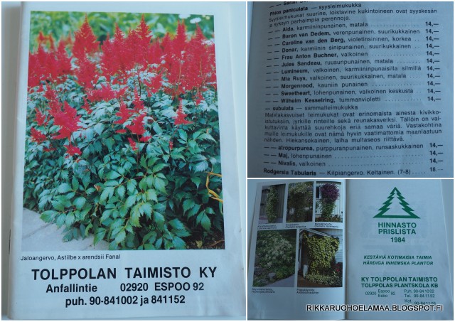 Samaisessa laatikossa oli myös paksu pinkka espoolaisen Tolppolan taimiston kuvastoja/hinnastoja, joista vanhin vuodelta 1984 kuvassa. Vuonna 1953 perustettu Tolppolan taimisto on yhä voimissaan, vaikka jostain syystä siellä tulee harvemmin käytyä ostoksilla. Meidän omenapuut ja marjapensaat sekä moni pensaskin on sieltä ostettu.